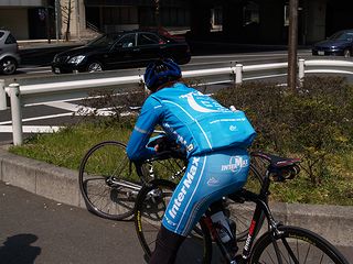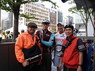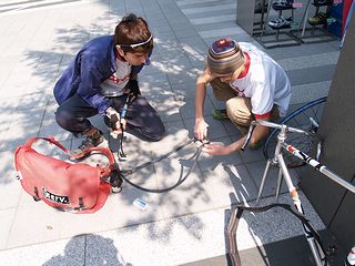 スペアチューブや携帯ポンプを持っていなかったブーは スペアチューブ担当 :T-SERV タイヤ交換・工具担当:PEARL IZUMI フロアポンプ担当 :Bridgestone Anchor と勝手に決め、タイヤ交換をしてもらった。 もちろん、自分の手は汚れませんでした。 |