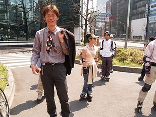 更に、こんな珍客も ただでさえ背が高いのに インラインスケートなんか履いているから やたら巨大に見えるのは、いつもの事 本人はシークレットブーツと主張する 恒例シティーランの途中 |