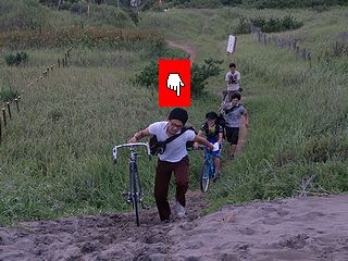 一通り説明が終わったら レース開始!!! まず 「自転車に乗る事で退化した脚力」 で勝負! |