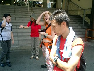 今日は「山登り」と聞いています。 が、皆さん軽装です。 「山の天気は変わりやすい」という、ドコでも聞く情報を元に カッパなど、ブーの装備は超高校生級です。 |