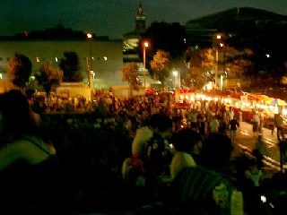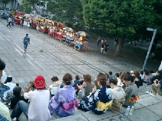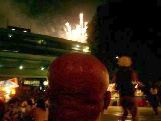 開演近辺の時間になると、人も多くなってきます 「どーん、どーん!」 どうやら始まったようです! 「どーん、ぱらぱら!」 あれ?音しか聞こえない!!! またしてもハプニング発生! ココでは何も見えない! |