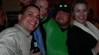 今日は、お店の二周年記念パーティーの日 むむむむ、「打合せ」は聞き間違い? 右端が店長 |