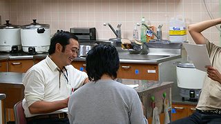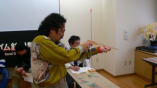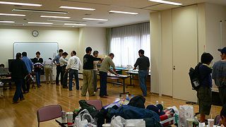 競技中、理事長は何かの取材を受けていた。 後ろに見える炊飯器や笑顔が この団体の、のどかさを象徴するかの様だ |
