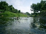 ■相模湖に向け出発■ | 途中、名も無い川のせせらぎに誘われ、水と戯れる。 前回のサイクリングの反省から、水着を持ってくるも 間違えて競泳用の水着を持ってきたために、 着替えをためらう。 次回はビーチサンダルを持参しようと思う。 |